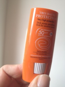On the way to the yard last night, even though it was slightly overcast when I left the house, I took up my Stick Zones Sensibles by Eau Thermale Avène, and rubbed it all over my face. This seems like a good one to bring to the yard, because it’s small, and it’s waterproof. And even though I am riding with a helmet, and it’s got a wee brim, I can still get colour.