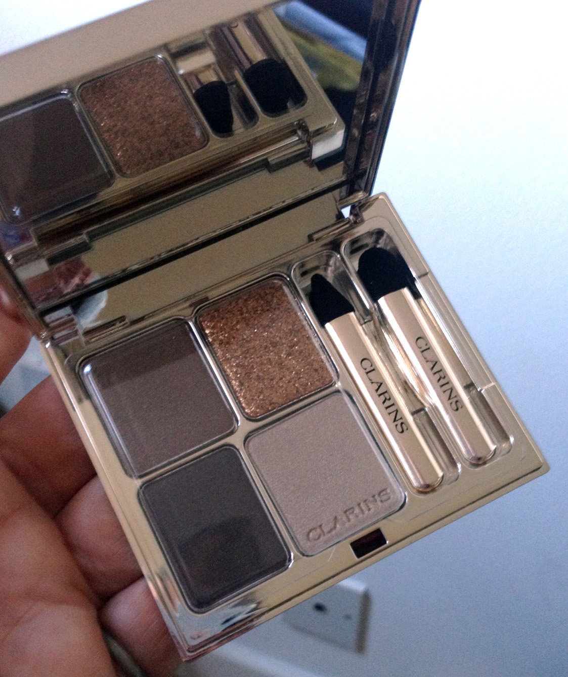 Today’s palette: Clarins Ombre Minérale 4 Couleurs {€40} in Odyssey, which may be a limited edition. Look at that goldy one! This is a terrific palette for wearing during the day, then sparking up with that goldy bit!