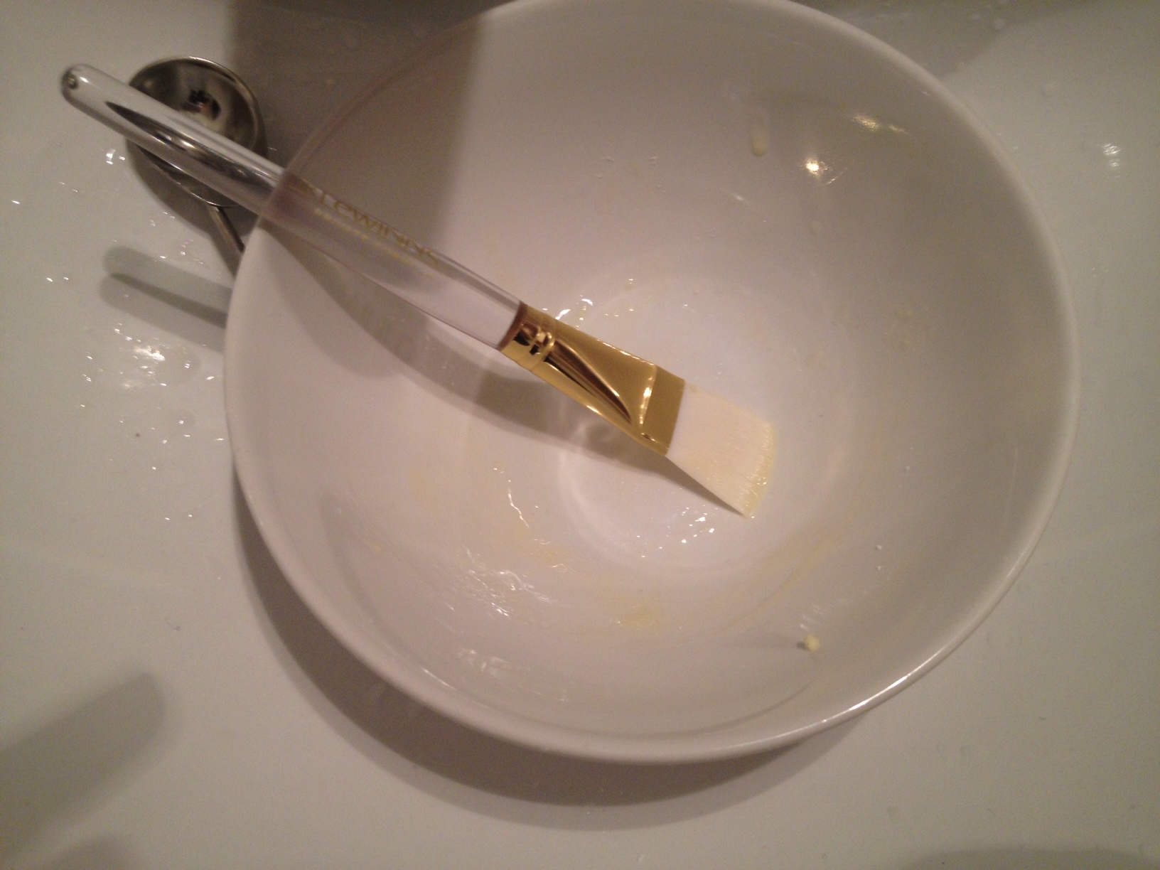 Then: two teaspoons of the cleanser mixed with water. This was eyeballed: I tried to use the teaspoon, but it was pointless in the extreme. You have to squueze the cleanser out, not scoop it out, so filling up the teaspoon was rendering fairly imposs. I mixed it, as directed with one teaspoon of water, and used the brush to stroke it all over my face. this served to loosen the mask — gently, gently — and then used a few cotton pads to get the last bits off.