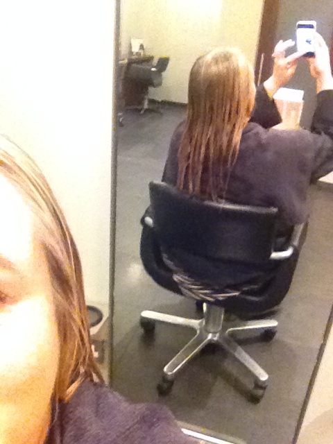 Here’s my hair after it had been drenched from root to end with the product. There was a brand advisor present, and she told my stylist that the recommended dosage was 15mls. 15 mls for The Hair! Ha!
