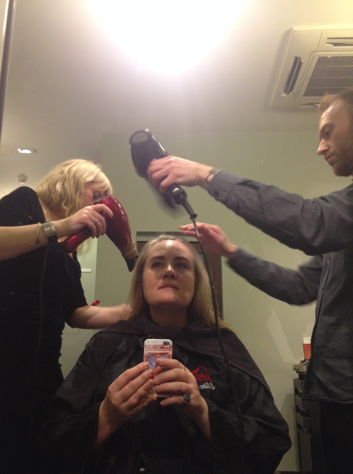 In a smart move, the stylists who had gathered round my chair decided to just blast The Hair dry, in the same exact way I do it every day, except in this case, I didn’t flip my head over. With two of them at it, it took no time at all to dry. John points out that ‘the IRS is a conditioning treatment that will add strength and shine to the hair, making it easier to blow dry and manage.’ Saw the proof of that immediately!